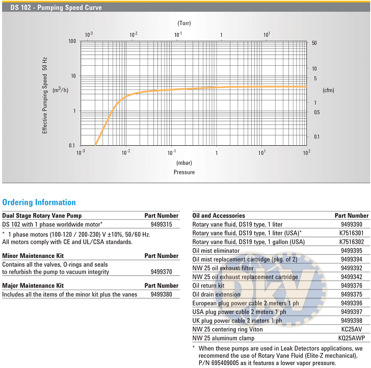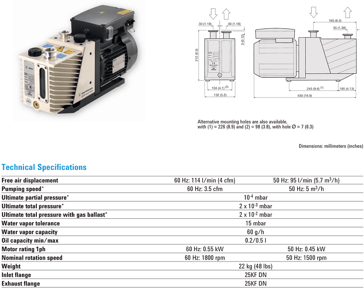 - Bơm chân không Agilent DS 102 sử dụng động cơ: 0.45 kW, điện áp 230V/50Hz/1ph, tốc độ vòng quay động cơ max: 1.500 vòng/phút.