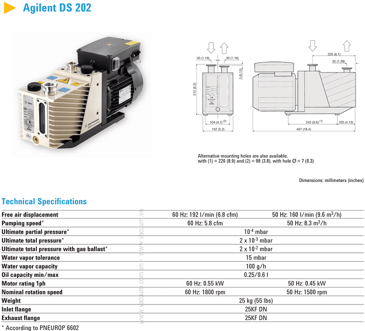 - Size kết nối vào/ra bơm chân không Agilent DS 202: 25KF DN.