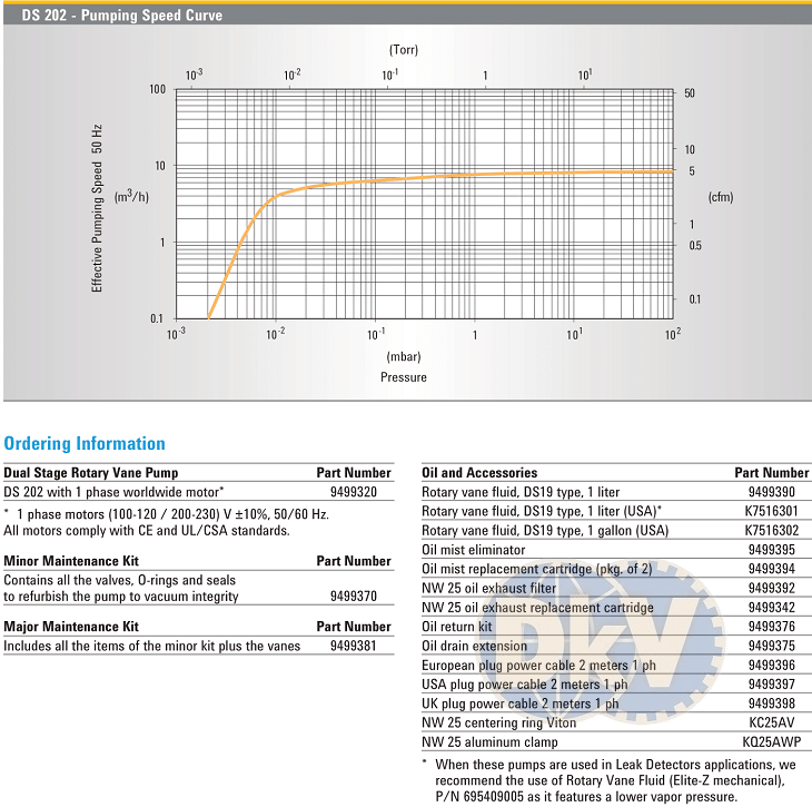 - Bơm chân không Agilent DS 202 sử dụng động cơ: 0.45 kW, điện áp 230V/50Hz/1ph, tốc độ vòng quay động cơ max: 1.500 vòng/phút.