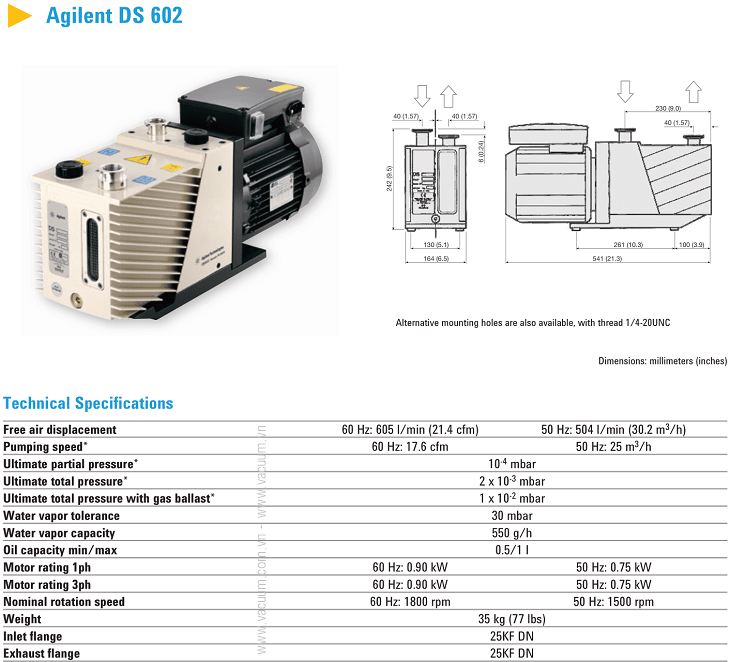- Bơm chân không Agilent DS 602 sử dụng động cơ: 0.75 kW, điện áp 230V/50Hz/1ph hoặc 380V/50Hz/3ph, tốc độ vòng quay động cơ max: 1.500 vòng/phút.