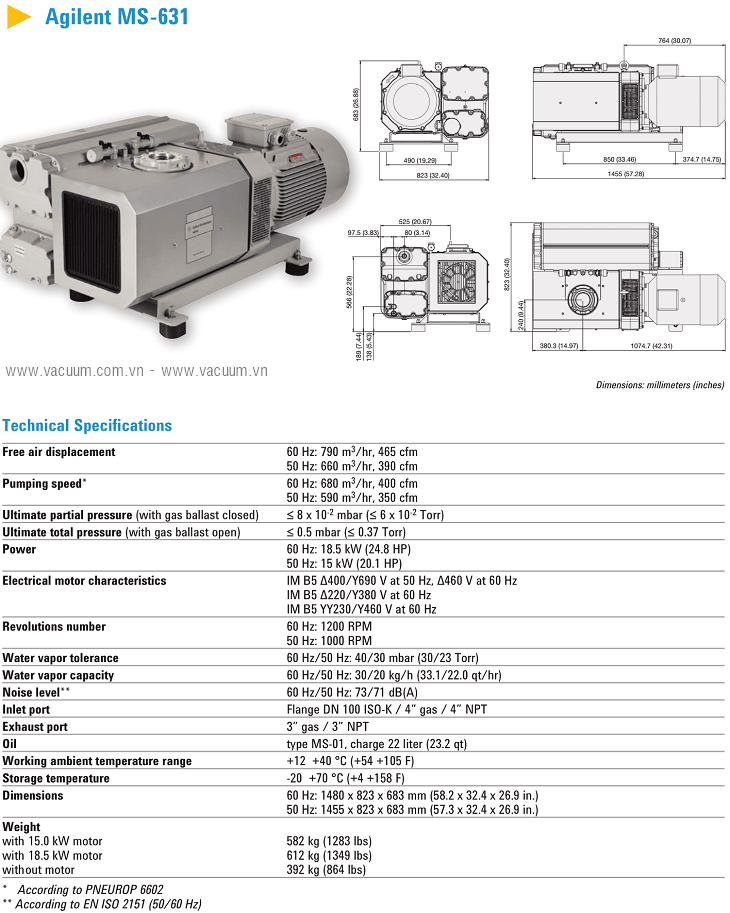 - Bơm chân không Agilent MS-631 sử dụng động cơ: 15 kW, điện áp 380V/50Hz/3ph, tốc độ vòng quay động cơ max: 1.000 vòng/phút.