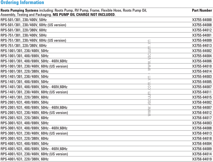 - Bơm chân không Agilent RPS-4001/631 sử dụng động cơ: 11.0 + 15 kW, điện áp 380V/50Hz/3ph.