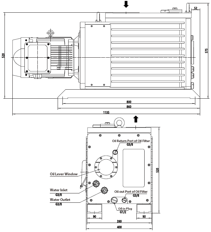 - Quy cách của bơm chân không Baosi DRV275: trọng lượng: 255 kg, kích thước bao (dài x rộng x cao): 1135 x 400 x 520 mm.
