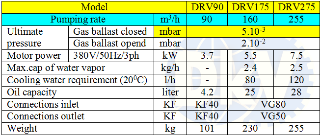 - Bơm chân không Baosi DRV275, Baosi dual stage oil rotary vane vacuum pumps DRV275 thuộc dạng bơm hút chân không vòng dầu (oil-flooded), cánh gạt, 2 cấp, có lưu lượng: 255 m3/h, độ chân không 5 x 10-3 mbar ( 5 x10-1 Pa) chuyên dùng để hút chân không trong công nghiệp.