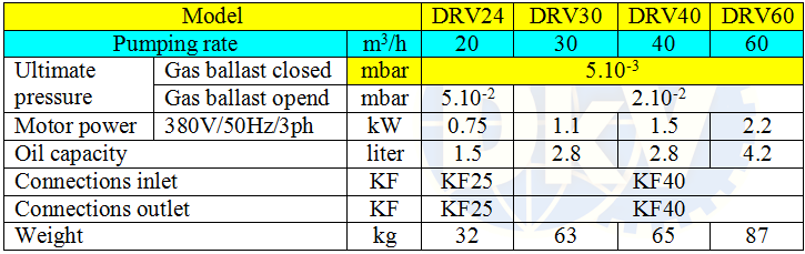 - Bơm chân không Baosi DRV40, Baosi dual stage oil rotary vane vacuum pumps DRV40 thuộc dạng bơm hút chân không vòng dầu (oil-flooded), cánh gạt, 2 cấp, có lưu lượng: 40 m3/h, độ chân không 5 x 10-3 mbar ( 5 x10-1 Pa) chuyên dùng để hút chân không trong công nghiệp.