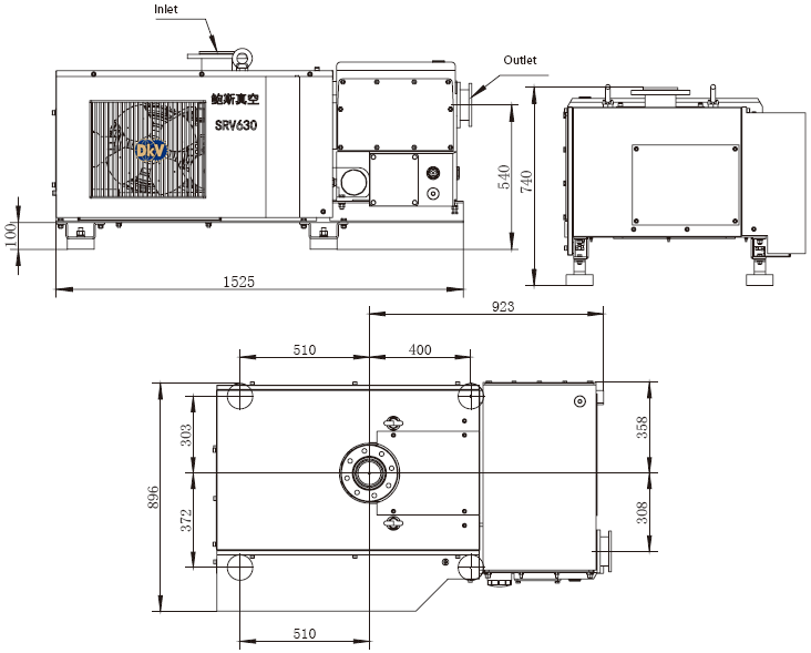 - Quy cách của bơm chân không Baosi SRV630A: trọng lượng: 695 kg, kích thước bao (dài x rộng x cao): 1525 x 896 x 740 mm.