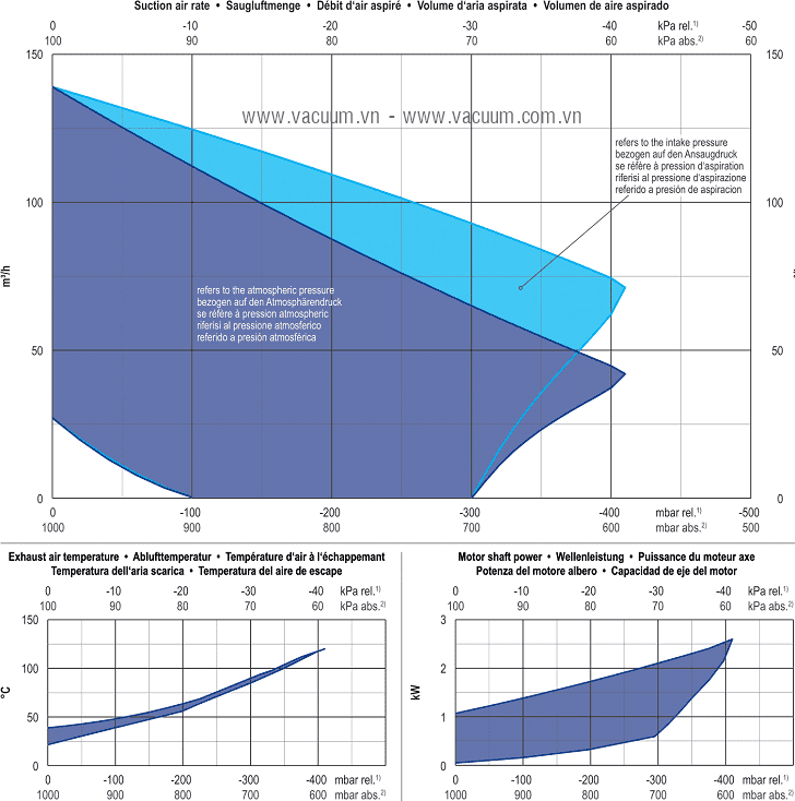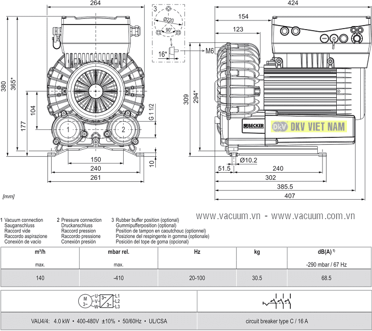 - Bơm chân không Becker VARIAIR SV 130/2 sử dụng động cơ: 4.0 kW 400V/50Hz/3ph, độ ồn tối đa: 68.5 dBA.
