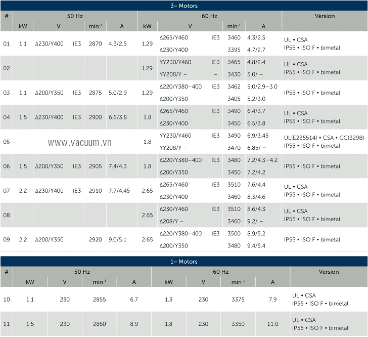 - Bơm chân không Becker VARIAIR SV 201/1 sử dụng động cơ: 1.29 - 2.65 kW 200-400V/50Hz/3ph, độ ồn tối đa: 66.3 dBA.