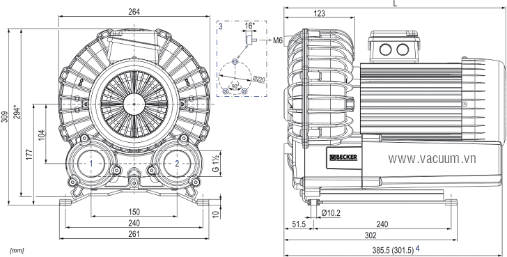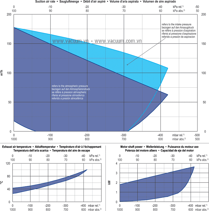 - Bơm chân không Becker VARIAIR SV 201/2 sử dụng động cơ: 4.0 kW 400V/50Hz/3ph, độ ồn tối đa: 73.5 dBA.