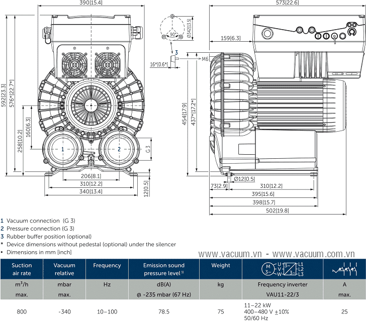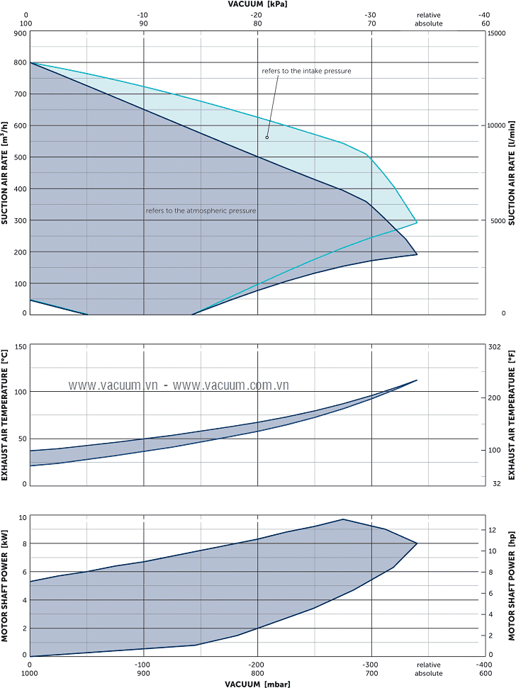 - Bơm chân không Becker VARIAIR SV 400/1 sử dụng động cơ: 11 - 22 kW 400V/50Hz/3ph, độ ồn tối đa: 78.5 dBA.