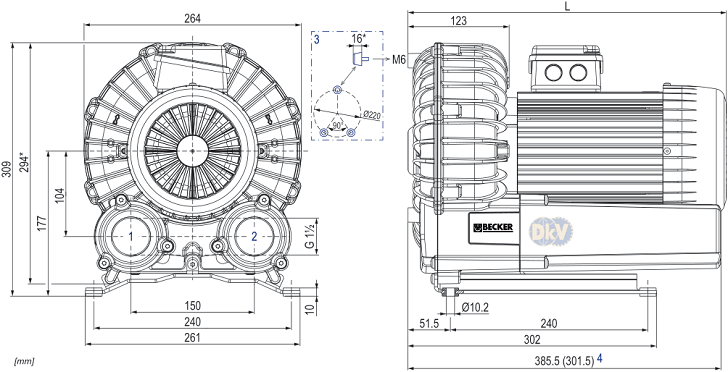 - Kích thước tổng thể của máy thổi khí chân không Becker SV 130/2 (dài x rộng x cao): 385.5 x 264 x 309 mm. Trọng lượng: 23 kg.