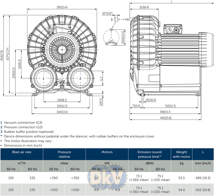 - Kích thước tổng thể của máy thổi khí chân không Becker SV 400/2 (dài x rộng x cao): 502 x 390 x 454 mm. Trọng lượng: 53.5 kg.