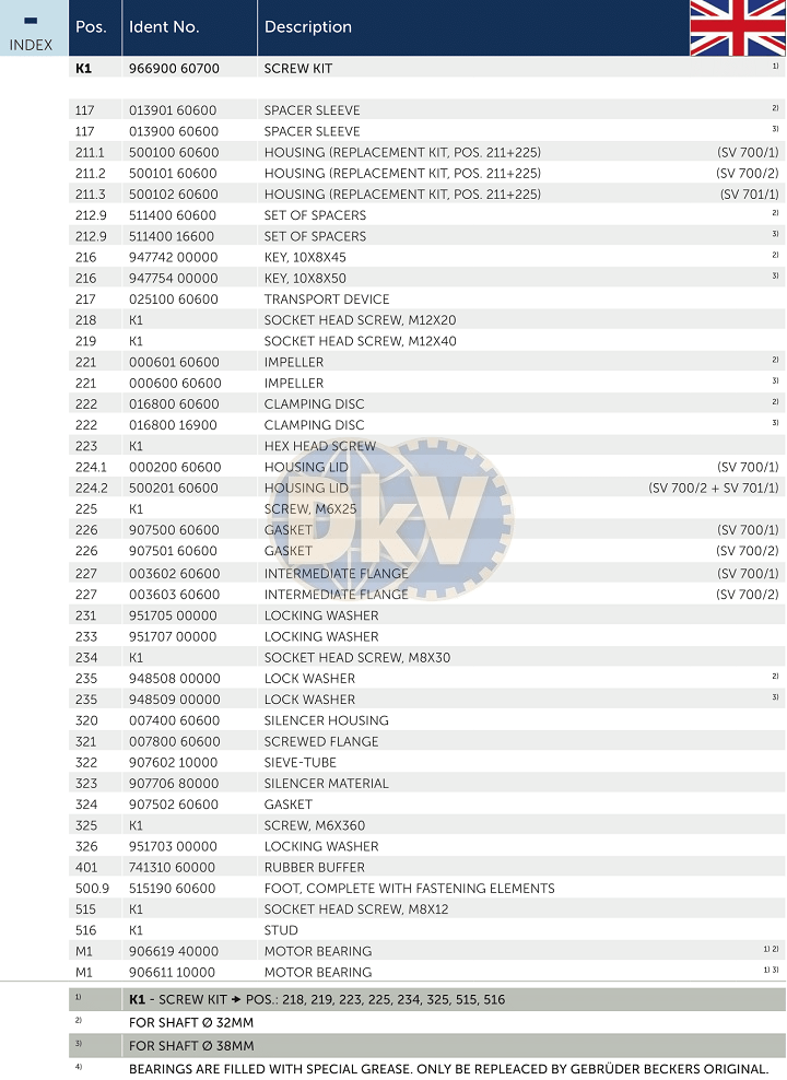 - Máy thổi khí chân không Becker SV 700/1 sử dụng động cơ: 5.5/11 kW 200-400V/50Hz/1-3ph, tốc độ vòng quay max: 2.935 rpm, độ ồn tối đa: 71 - 73 dBA.