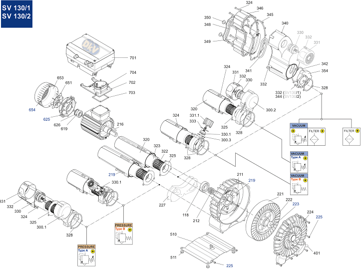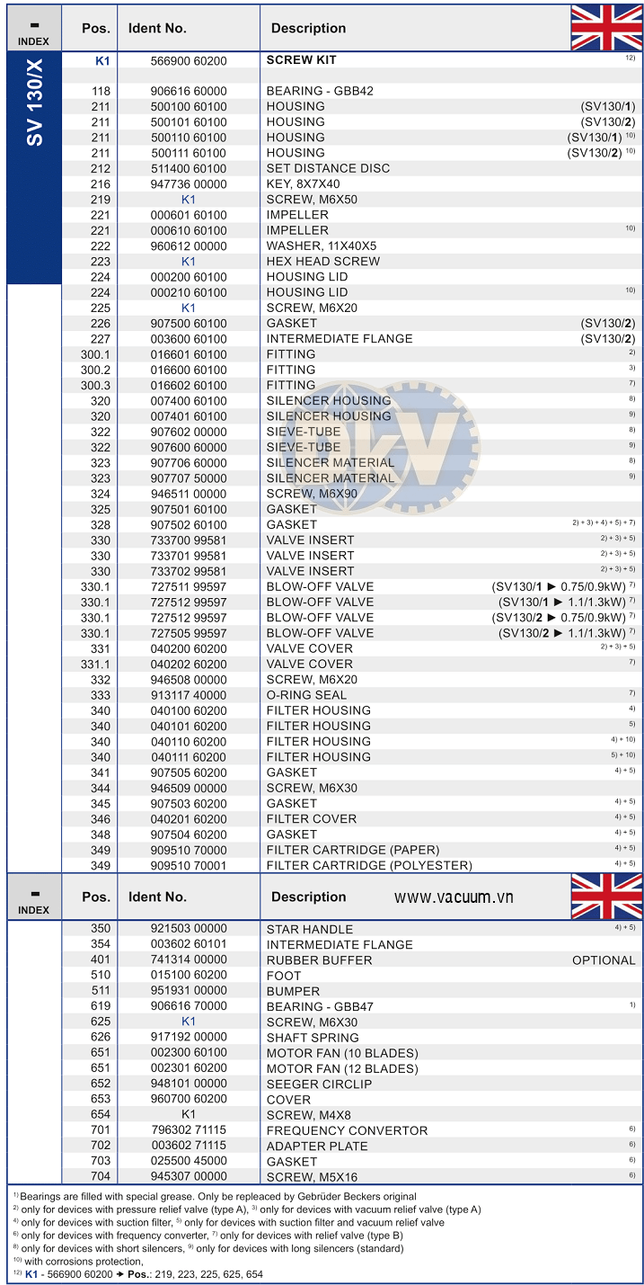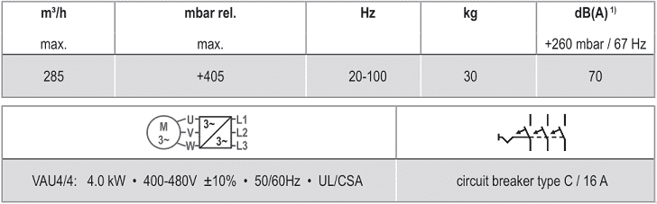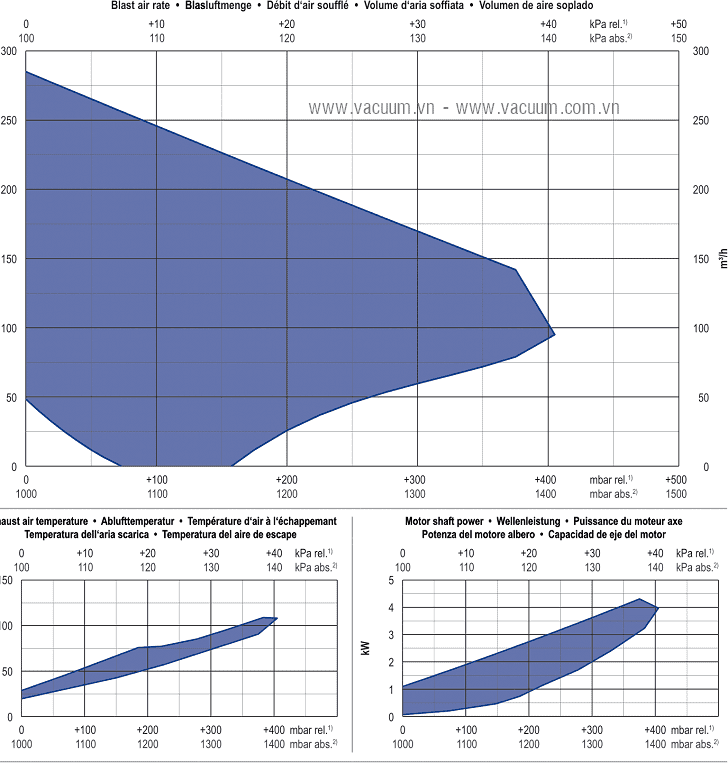- Máy thổi khí chân không Becker VARIAIR SV 130/1 sử dụng động cơ: 0.55/1.5 kW 200-400V/50Hz/1-3ph, tốc độ vòng quay max: 2.895 - 2.905 rpm, độ ồn tối đa: 70 dBA.