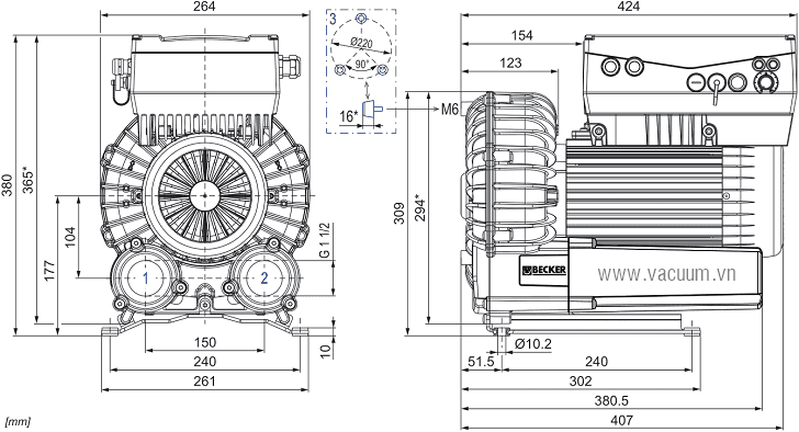 - Kích thước tổng thể của máy thổi khí chân không Becker VARIAIR SV 130/1 (dài x rộng x cao): 424 x 264 x 380 mm. Trọng lượng: 30 kg.