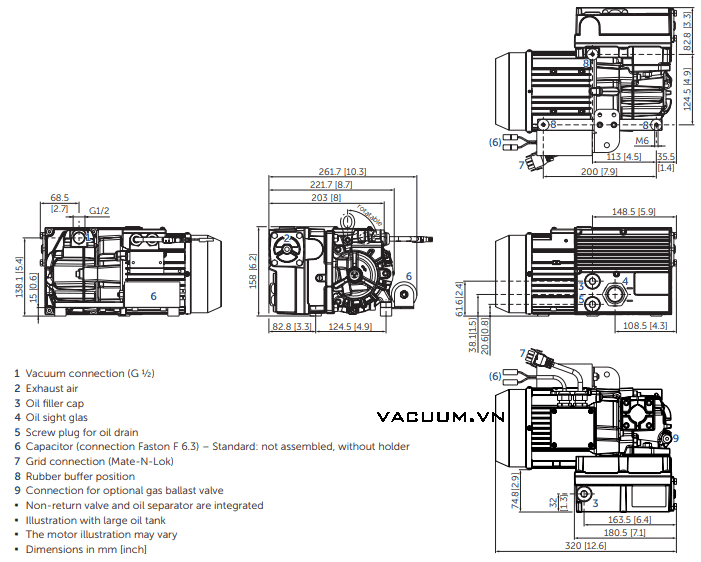 . - Quy cách của bơm chân không Becker O 5.10 (dài x rộng x cao): 320 x 261.7 x 158 mm. Trọng lượng: 17 kg | 18.5 kg.