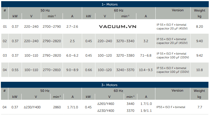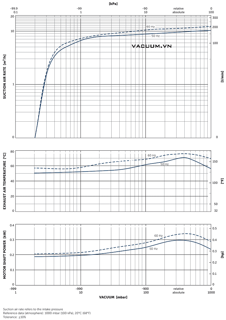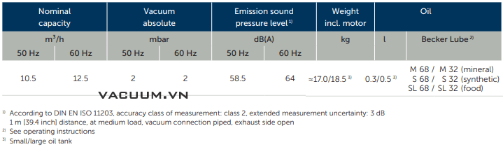 - Bơm chân không Becker O 5.10 có độ ồn trung bình: 58.5 dB(A), động cơ 0.45 kW/220-240V/50Hz/1ph hoặc 380-400V/50Hz/3ph (cấp bảo vệ IP55.ISO F), tốc độ vòng quay động cơ max: 2.700 - 2.820 vòng/phút.