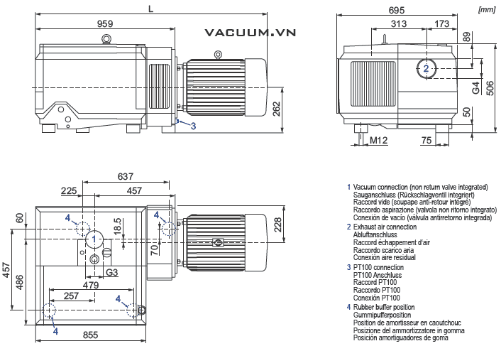 . - Quy cách của bơm chân không Becker U 4.630 F/K (dài x rộng x cao): 1.445 x 695 x 506 mm. Trọng lượng: 517 - 567 kg.