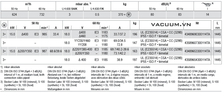 - Bơm chân không Beker U 4.630 F/K có độ ồn trung bình: 80 dB(A), sử dụng động cơ 3 phase 15 kW/330 - 440 V/50Hz/3ph (cấp bảo vệ IP55.ISO F)