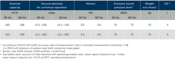 - Bơm chân không Becker U 5.166 có độ ồn trung bình: 70 dB(A), sử dụng động cơ 3 phase 3 kW hoặc 4 kW/380 V/50Hz/3ph (IE3, cấp bảo vệ IP55.ISO F), tốc độ vòng quay động cơ: 1.450 - 1.463 rpm.