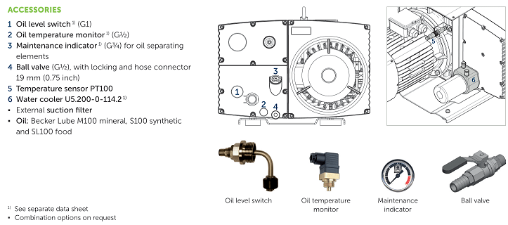 - Để việc vận hành bơm chân không Beker U 5.166 hoàn chỉnh, quý khách lên lắp thêm: áp kế (đồng hồ đo chân không - vacuum gauge) để giám sát độ chân không của bơm. Cũng như lọc gió đầu vào Becker (air inlet filter) để hạn chế bụi, dị vật lọt vào bơm.