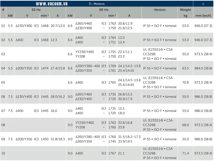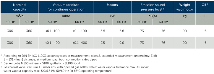 - Bơm chân không Becker U 5.301 có độ ồn trung bình: 73 dB(A) sử dung động cơ 3 phase 5.5 hoặc 7.5 kW/330 - 440 V/50Hz/3ph (cấp bảo vệ IP55.ISO F), tốc độ vòng quay động cơ: 1.445 - 1.474 rpm.