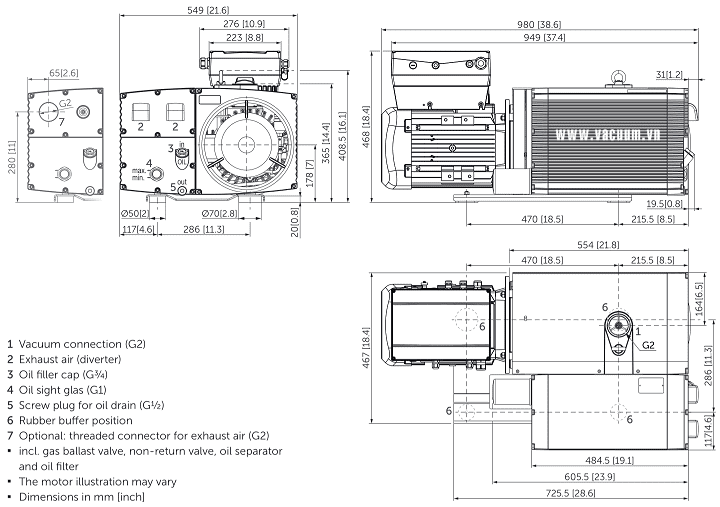 . - Quy cách của bơm chân không Becker Variair U 5.101 (dài x rộng x cao): 980 x 549 x 468 mm. Trọng lượng: 71.5 kg.