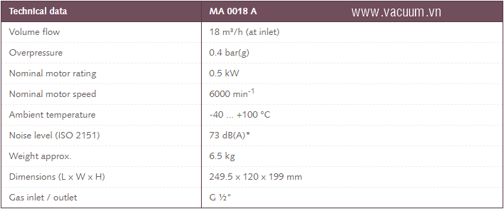 - Bơm chân không Busch MINK MA 0018 A sử dụng động cơ: 0.5 kW, tốc độ vòng quay max: 6.000 rpm, độ ồn tối đa: 73 dBA.