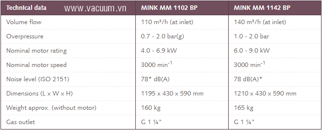 - Bơm chân không Busch MINK MM 1102 BP sử dụng động cơ: 4 - 6.9 kW, tốc độ vòng quay max: 3.000 rpm, độ ồn tối đa: 78 dBA.
