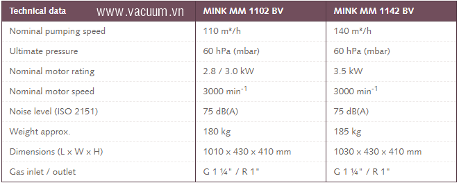 - Bơm chân không Busch MINK MM 1142 BV sử dụng động cơ: 3.5 kW, tốc độ vòng quay max: 3.000 rpm, độ ồn tối đa: 75 dBA.