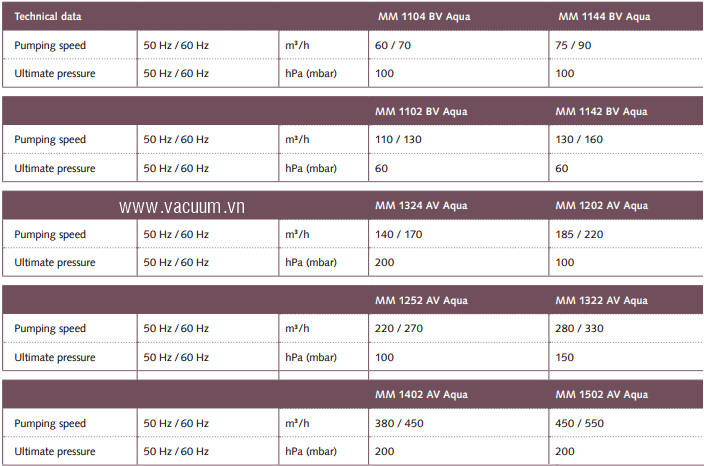 - Bơm chân không Busch MINK MM 1142 BV sử dụng động cơ: 3.5 kW, tốc độ vòng quay max: 3.000 rpm, độ ồn tối đa: 75 dBA.