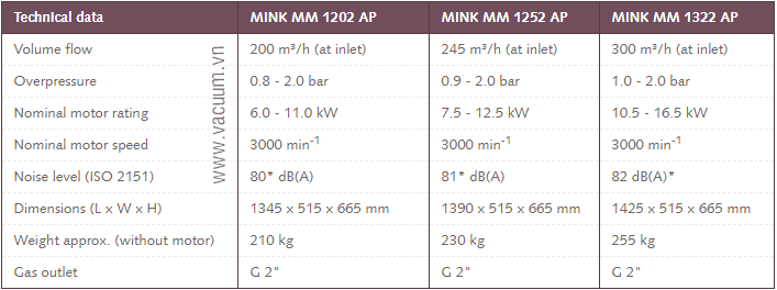 - Bơm chân không Busch MINK MM 1202 AP sử dụng động cơ: 6 - 11 kW, tốc độ vòng quay max: 3.000 rpm, độ ồn tối đa: 80 dBA.