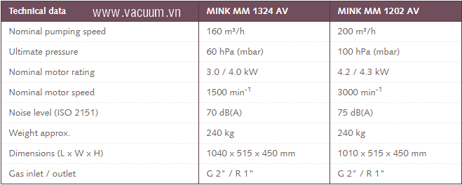 - Bơm chân không Busch MINK MM 1202 AV sử dụng động cơ: 4.2/4.3 kW, tốc độ vòng quay max: 3.000 rpm, độ ồn tối đa: 75 dBA.