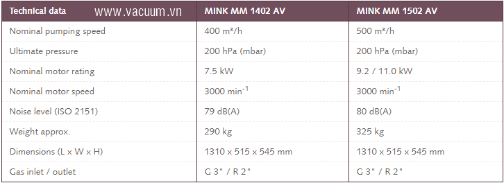 - Bơm chân không Busch MINK MM 1402 AV sử dụng động cơ: 7.5 kW, tốc độ vòng quay max: 3.000 rpm, độ ồn tối đa: 79 dBA.