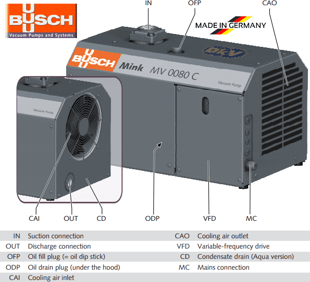 - Kích thước tổng thể của bơm chân không Busch MINK MV 0080 D (dài x rộng x cao): 610 x 345 x 370 mm. Trọng lượng: 87 kg. Made in Germany.