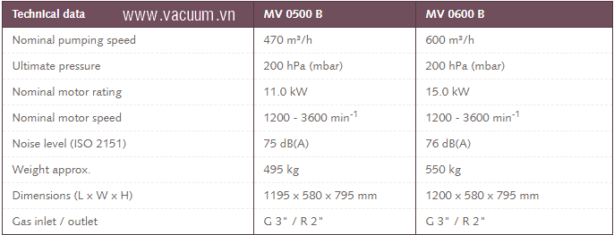 - Bơm chân không Busch MINK MV 0500 B sử dụng động cơ: 11 kW, tốc độ vòng quay max: 1.200 - 3.600 rpm, độ ồn tối đa: 75 dBA.