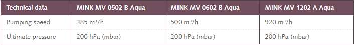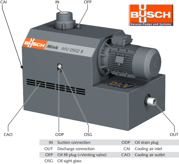 - Bơm chân không Busch MINK MV 0502 B, Busch vacuum pump MINK MV 0502 B: là loại bơm chân khô (không dầu), thuộc dòng MINK do hãng Busch/Đức sản xuất, lưu lượng max: 385 m3/giờ, độ chân không tối đa: 200 mbar. Bơm chân không Busch MINK MV 0502 B sử dụng phổ biến trong công nghiệp, đặc biệt công nghiệp sạch.