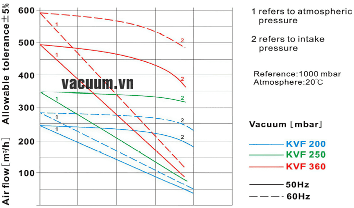 - Bơm chân không DKV KVF 360, DKV dry running rotary vane vacuum pump KVF 360 thuộc dạng bơm hút chân không khô, không dầu (Dry vacuum pump) có lưu lượng: 351 m3/h, độ chân không đạt 250 mbar chuyên dùng để hút chân không trong công nghiệp.