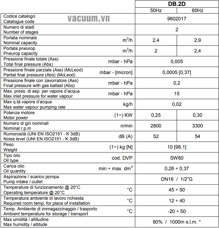 - Bơm chân không DVP DB 2D có độ ồn max: 52 dB(A), sử dụng động cơ: 0.25 kW/230V/50Hz/1ph, tốc độ vòng quay động cơ max: 2.800 vòng/phút.