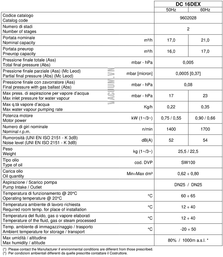 - Bơm chân không chống cháy nổ DVP DC 16DEx, bơm hút chân không phòng nổ DVP DC 16DEx, DVP lubricated rotary vane vacuum pumps DC 16DEx thuộc dạng bơm hút chân không vòng dầu (oil-flooded), 2 cấp (dual stage), loại nhỏ, trang bị động cơ điện phòng chống cháy nổ, có lưu lượng: 16 m3/h, độ chân không đạt: 5.10-3 mbar (khi đóng chấn lưu khí Gas ballast), 0.08 mbar (khi mở chấn lưu khí Gas ballast), độ chân không tuyệt đối 5.10-4 mbar (khi đóng chấn lưu khí Gas ballast), chuyên dùng để hút chân không trong công nghiệp.