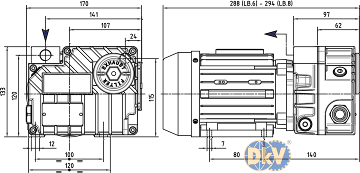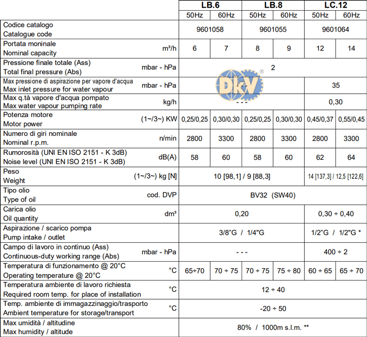 - Bơm chân không DVP LC 12 có độ ồn max: 62 dB(A), sử dụng động cơ: 0.45 kW /230V/50Hz/1ph hoặc 0.37 kW/380V/50Hz/3ph, tốc độ vòng quay động cơ max: 2.800 vòng/phút.