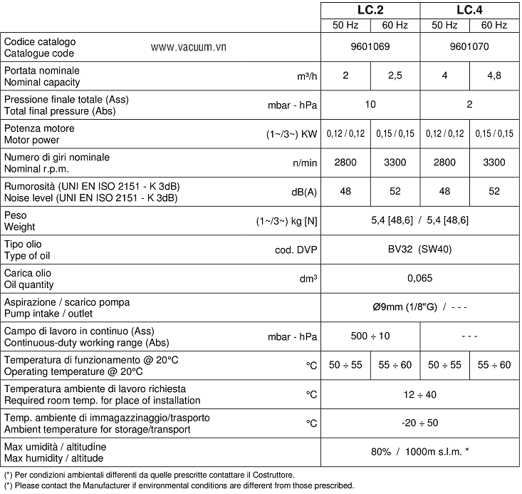 - Bơm chân không DVP LC 4 có độ ồn max: 48 dB(A), sử dụng động cơ: 0.12 kW/230V/50Hz/1ph hoặc 0.12kW/380V/50Hz/3ph, tốc độ vòng quay động cơ max: 2.800 vòng/phút.