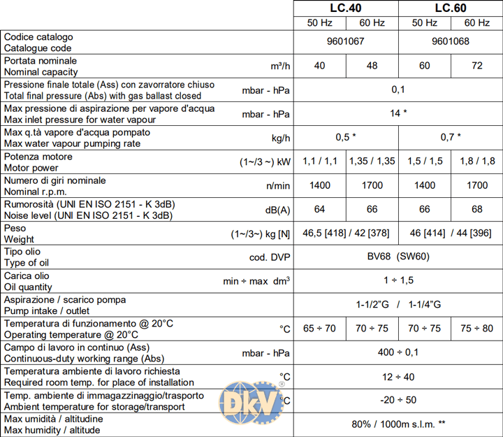 - Bơm chân không DVP LC 60 có độ ồn max: 66 dB(A), sử dụng động cơ: 1.5 kW /230V/50Hz/1ph hoặc 1.5 kW/380V/50Hz/3ph, tốc độ vòng quay động cơ max: 1.400 vòng/phút.