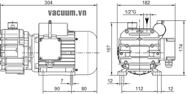 - Size kết nối vào/ra bơm chân không DVP SB 12: 1/2"G.