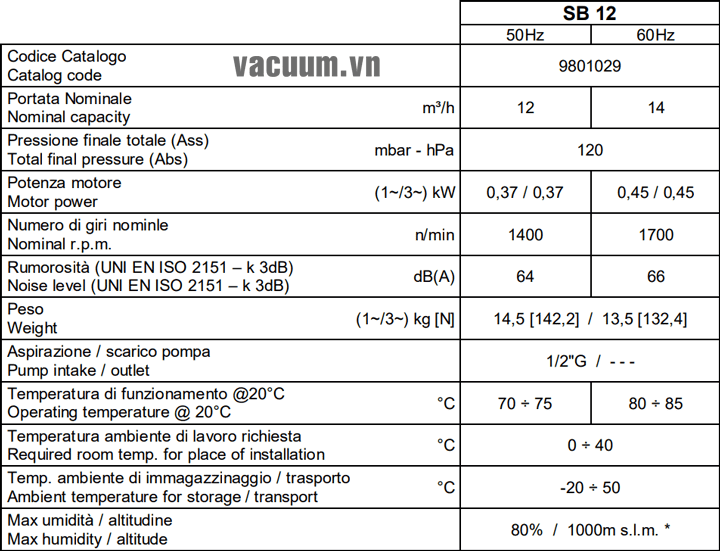 - Bơm chân không DVP SB 12 sử dụng động cơ: 0.37 kW, điện áp 230V/50Hz/1ph hoặc 380V/50Hz/3ph, tốc độ vòng quay động cơ max: 1.400 vòng/phút.