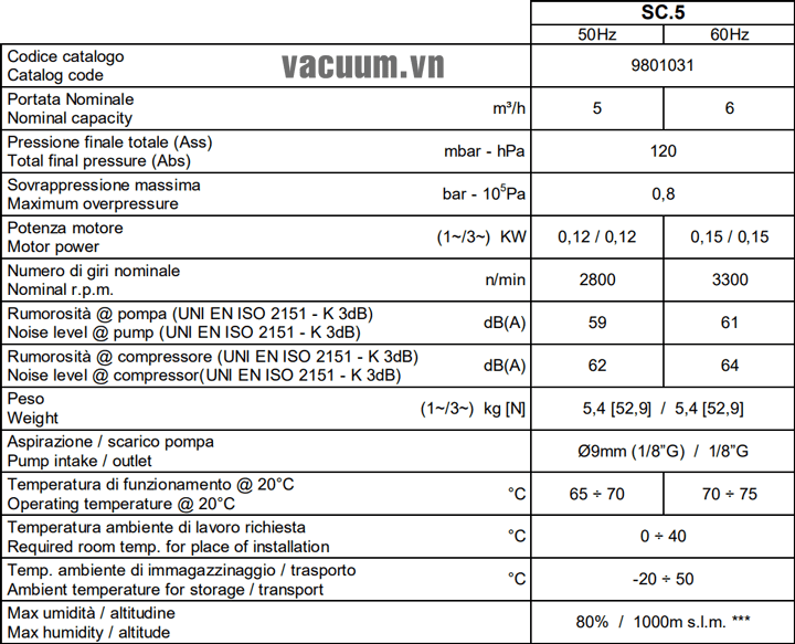 - Bơm chân không DVP SC 5 sử dụng động cơ: 0.12 kW, điện áp 230V/50Hz/1ph hoặc 380V/50Hz/3ph, tốc độ vòng quay động cơ max: 2.800 vòng/phút. có độ ồn max: 59/62 dB(A).