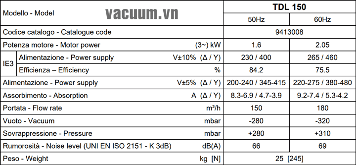 - Máy thổi khí chân không DVP TDL 150 sử dụng động cơ: 1.6 kW điện áp 380V/50Hz/3ph, độ ồn tối đa: 66 dB(A).