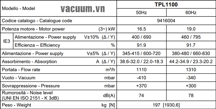 - Máy thổi khí chân không DVP TPL 1100 sử dụng động cơ: 16.5 kW điện áp 380V/50Hz/3ph, độ ồn tối đa: 74 dB(A).