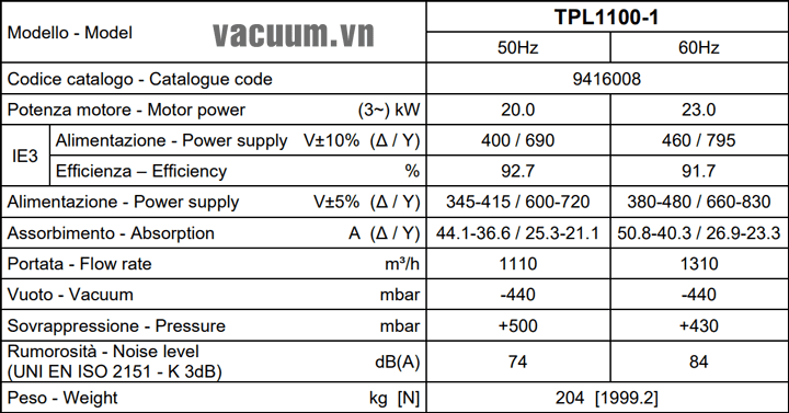 - Máy thổi khí chân không DVP TPL 1100-1 sử dụng động cơ: 20 kW điện áp 380V/50Hz/3ph, độ ồn tối đa: 74 dB(A).