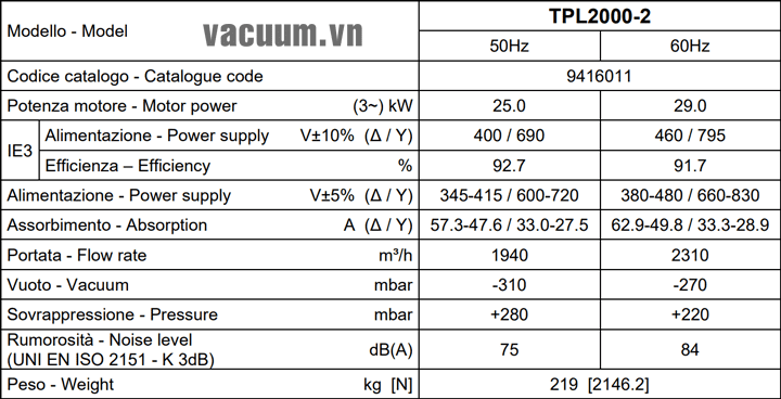- Máy thổi khí chân không DVP TPL 2000-2 sử dụng động cơ: 25 kW điện áp 380V/50Hz/3ph, độ ồn tối đa: 75 dB(A).